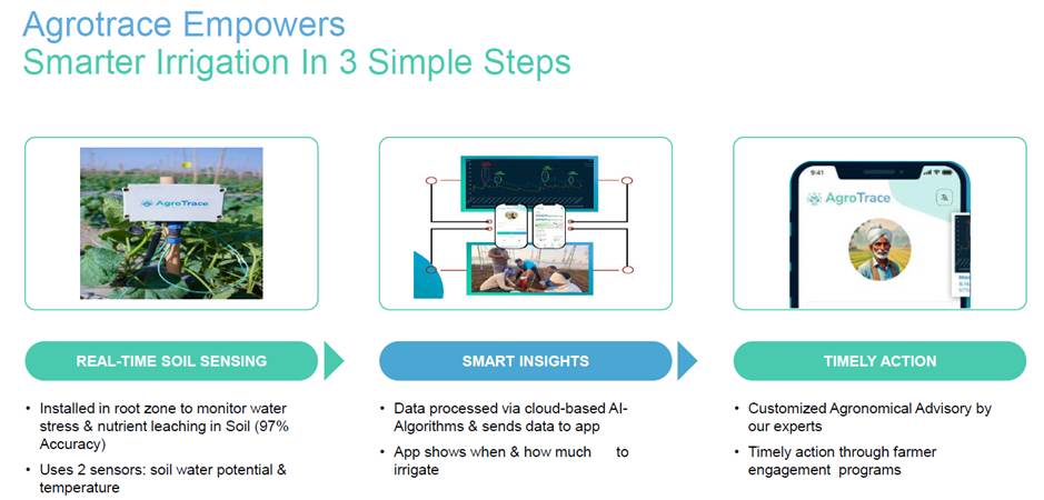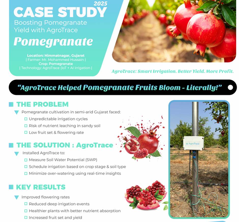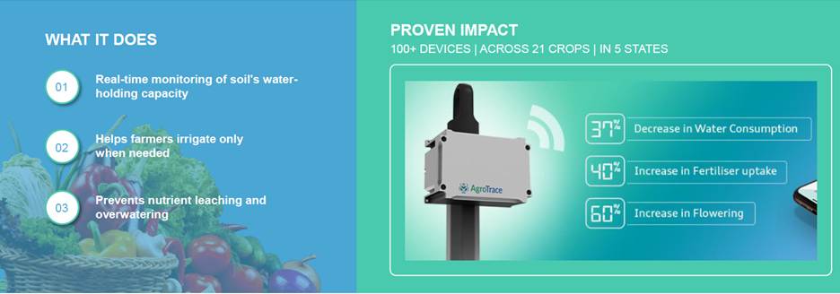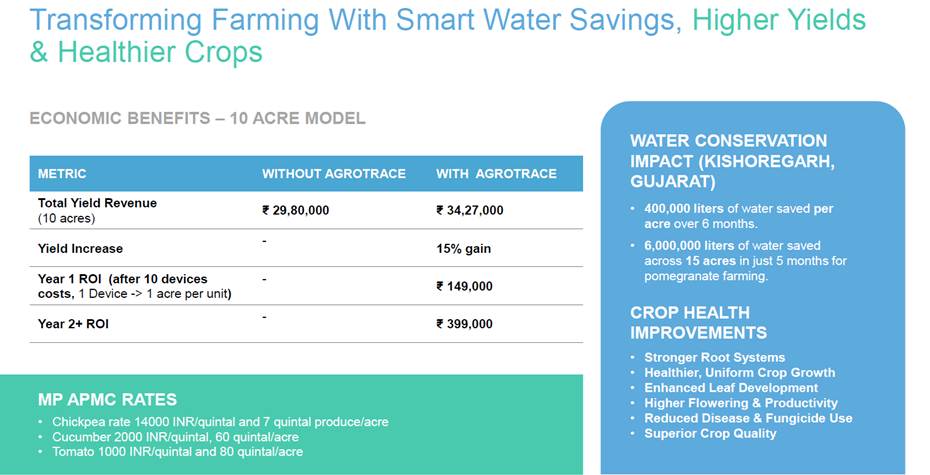 AgroTrace is a state-of-the-art IoT-enabled smart solution designed to optimize irrigation and fertigation management in agriculture. By using advanced sensors, proprietary AI algorithms, and IoT connectivity, AgroTrace ensures efficient use of water and nutrients, helping farmers reduce wastage and improve crop yield.